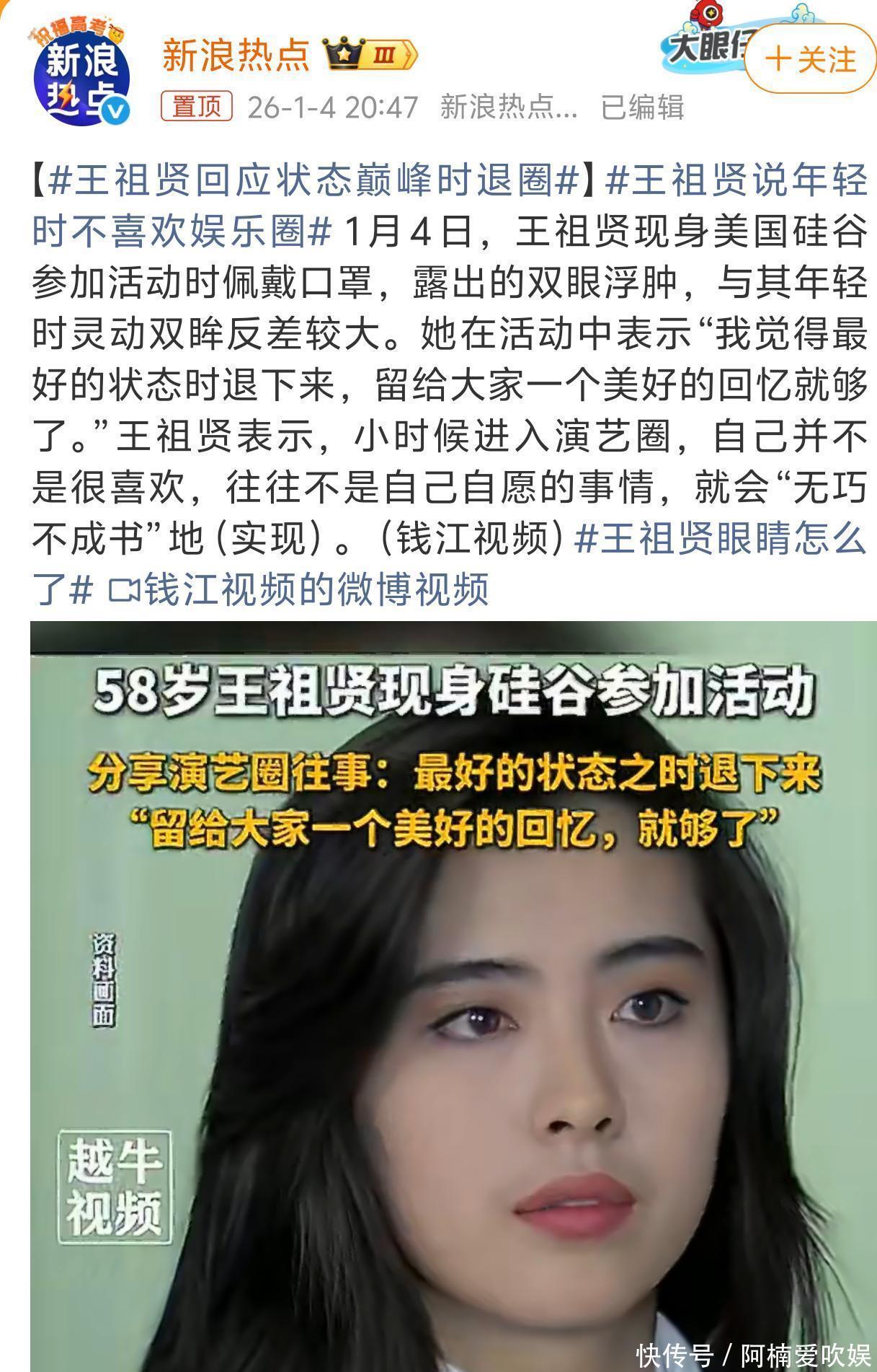 王祖贤近日现身美国硅谷的论坛活动,谈了她现在做的艾灸养生,提到当年巅峰时退圈,是因为想给观众留下一个美好的回忆,她自己不喜欢娱乐圈,年轻时进圈拍戏也不是自愿的。就是她的状态把网友吓一跳,她怎么会变这么憔悴,双眼浮肿僵硬,尤其是左眼,感觉快完全睁不开了。