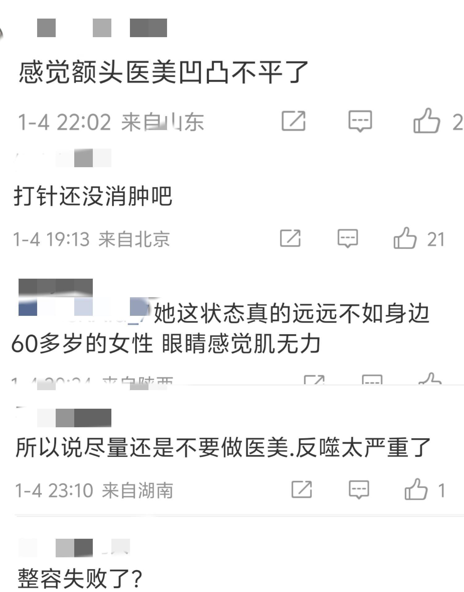 大部分网友质疑她早前医美过度、整容失败,才会让面部凹凸不平,副作用还影响到眼睛。